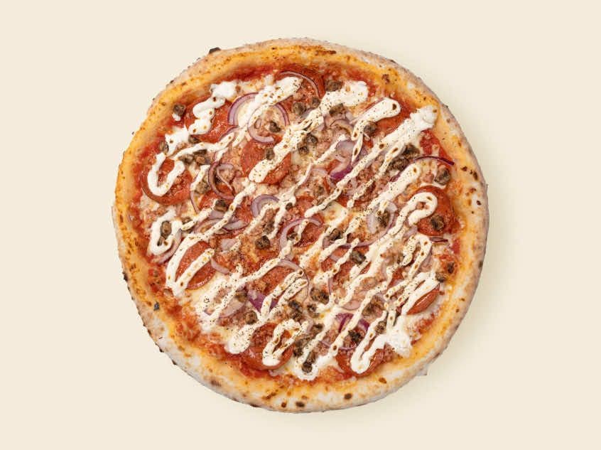 Pepperóní, laukur, ferskur chilli, jalapeno, blandaðar ólífur, piparostur og chillikrydd